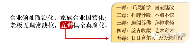 1、家族企业政治化。是指家族企业领袖们没有把管理企业作为头等大事,而是把跟官员打交道当做了重中之重。我曾是资深的政府官员,不少官员常请我吃饭。他们请我吃饭时,常会有一个老板坐在下手,通常话不多说,老是跟着笑,我明白他就是一个来买单的角色。我特别为这些弟兄们感到悲哀,我们成了“大户”人家的“奴才”。不少企业家花巨资去买政协委员、人大代表,你们知道在那些官员的眼里你们是什么吗?你能够担任这些职务的重要原因,也就是因为你的企业还行,如果你的企业完了,明天你就会被踢出去,成为酒桌上的笑谈。