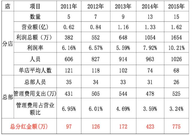 从上表我们可以看到,5年营业额从0.62亿涨到1.62亿,增长了161%,利润382万涨到1654万,增长了332%。利润率从6.16%涨到10.21%,增长了4.05%。总人数从606人涨到1026人,最重要的是单店的平均人数从121人,减少到68人,总部的管理人员从35人减少到26人,管理费从6.95%降为3.24%.
